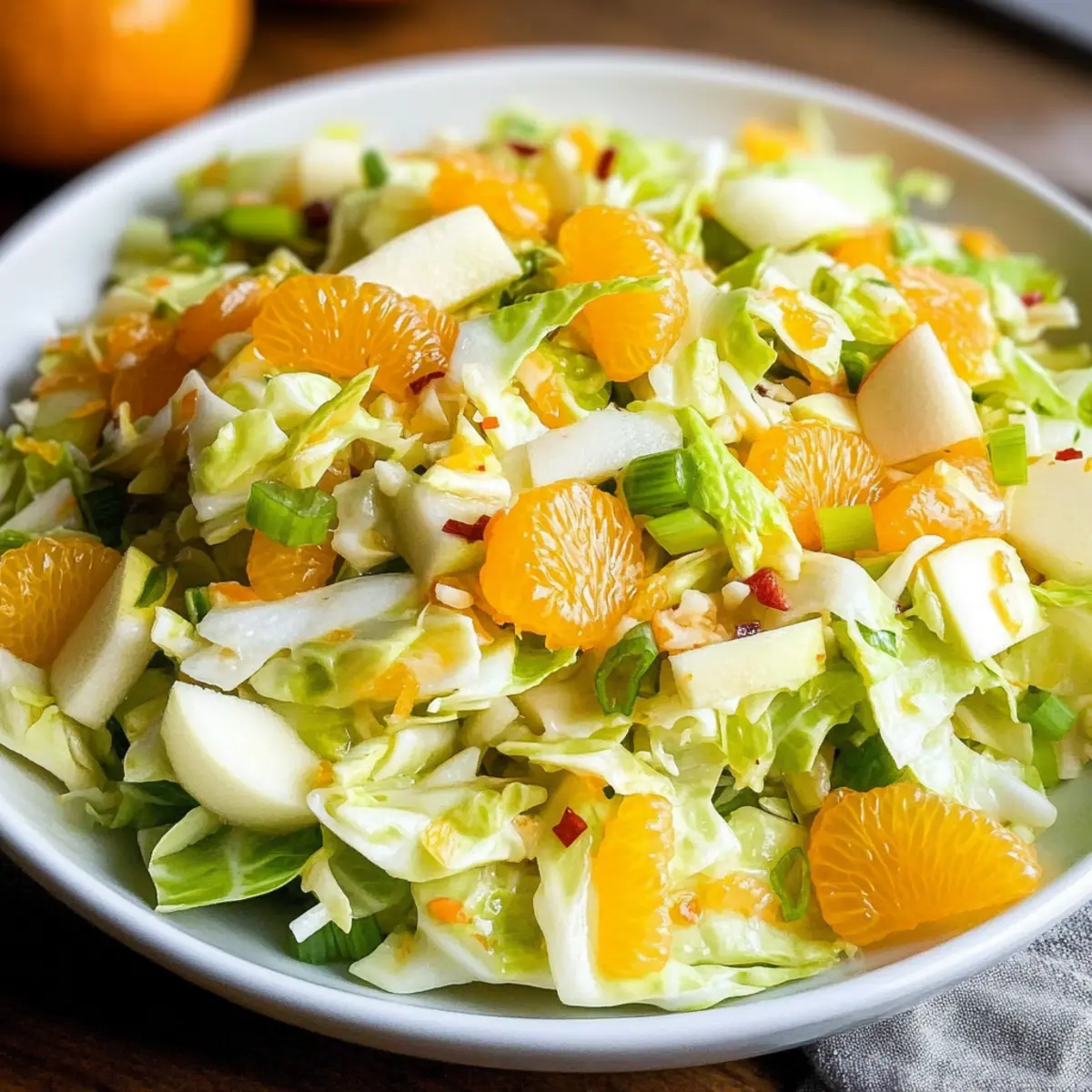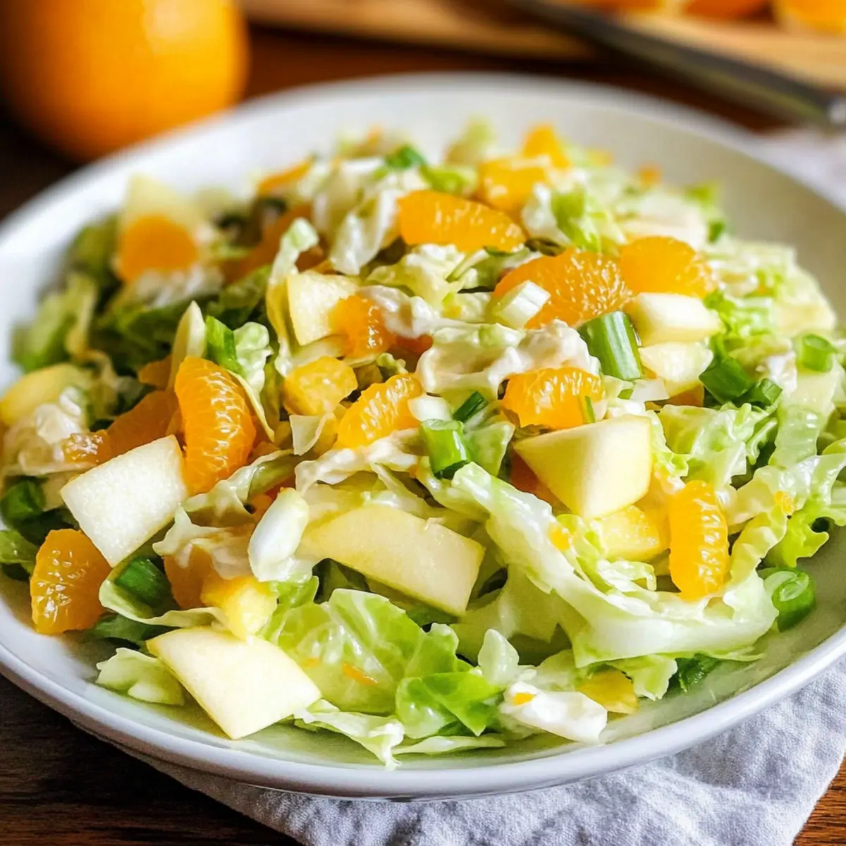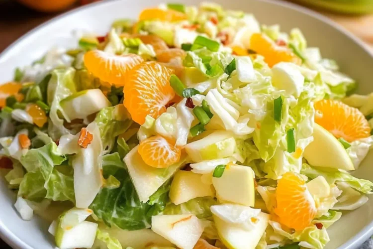 Ein frischer Chinakohlsalat mit Mandarinen und Apfel, ideal als gesunde Beilage.