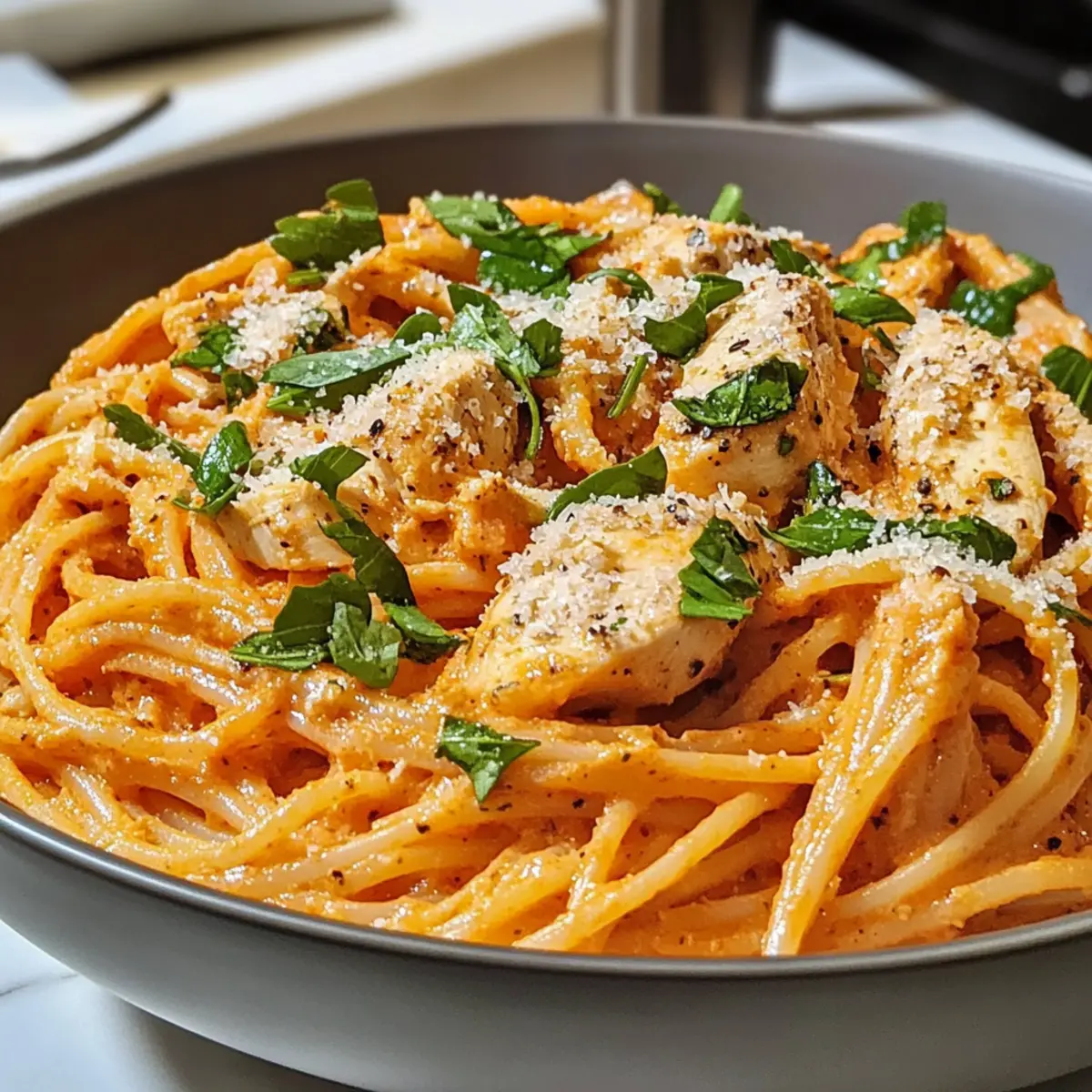 Für zusätzlichen Nährwert: Füge kurz vor dem Servieren frischen Spinat hinzu und rühre ihn um, bis er verwelkt. So erhält die cremige Tomaten-Hühnchen-Pasta eine gesunde Note.