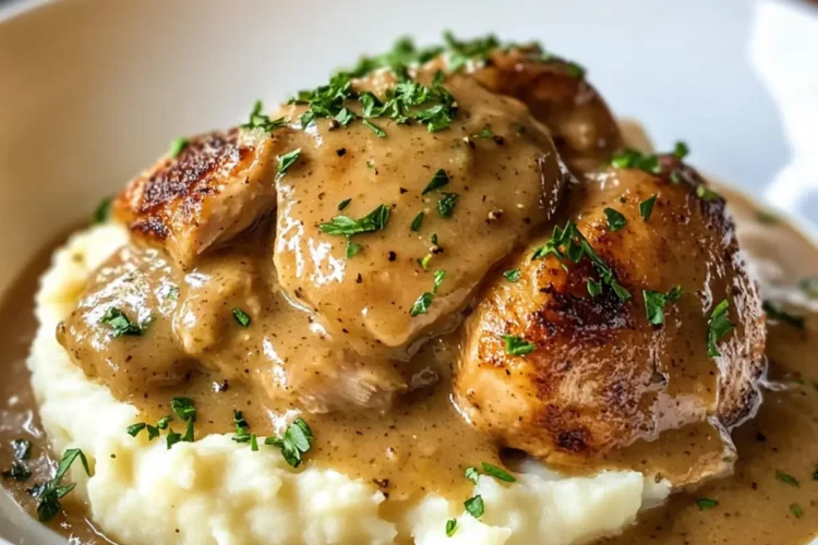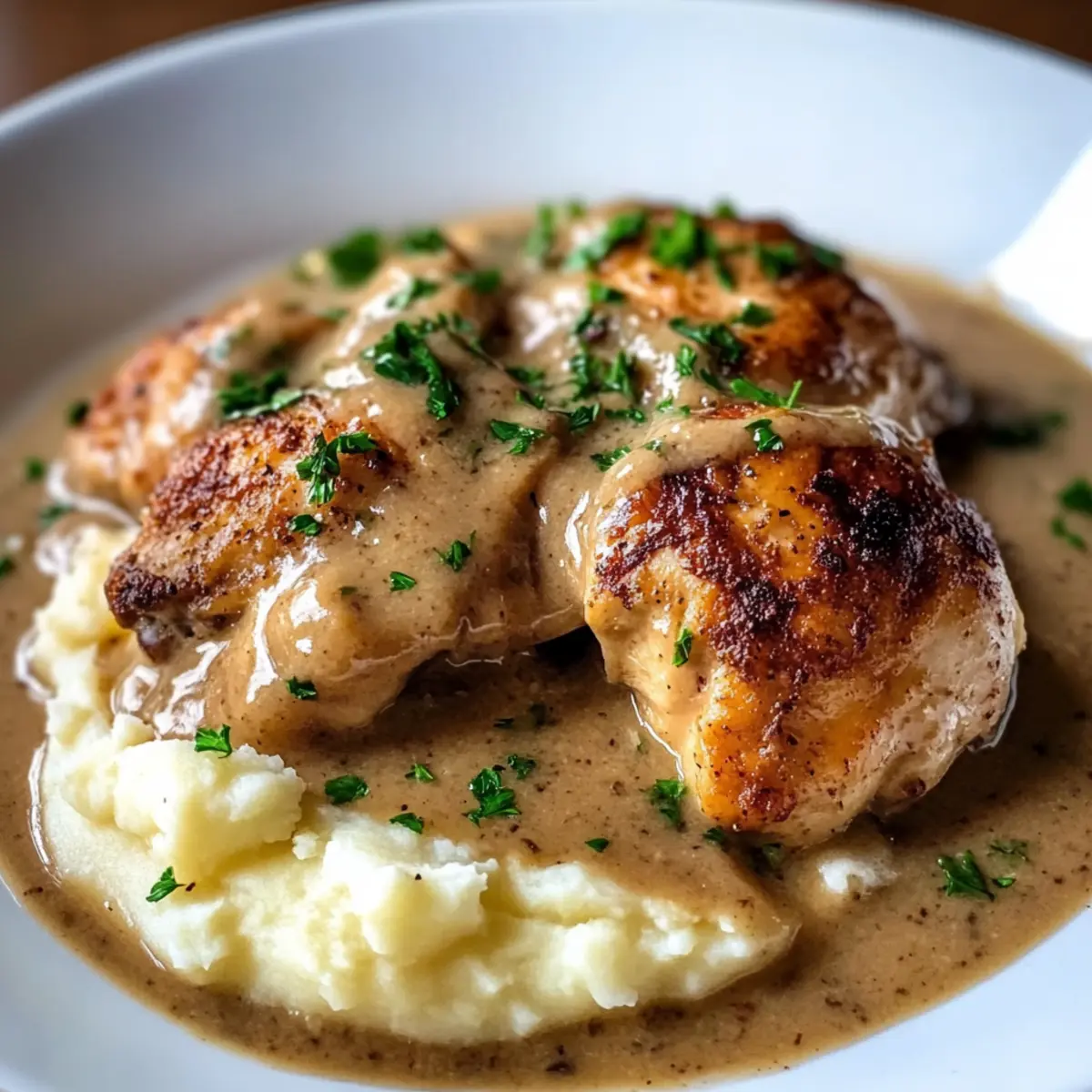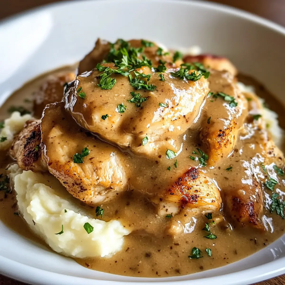 - Servieren Sie das Hähnchen über Reis oder Kartoffelpüree, optional mit Petersilie garnieren.