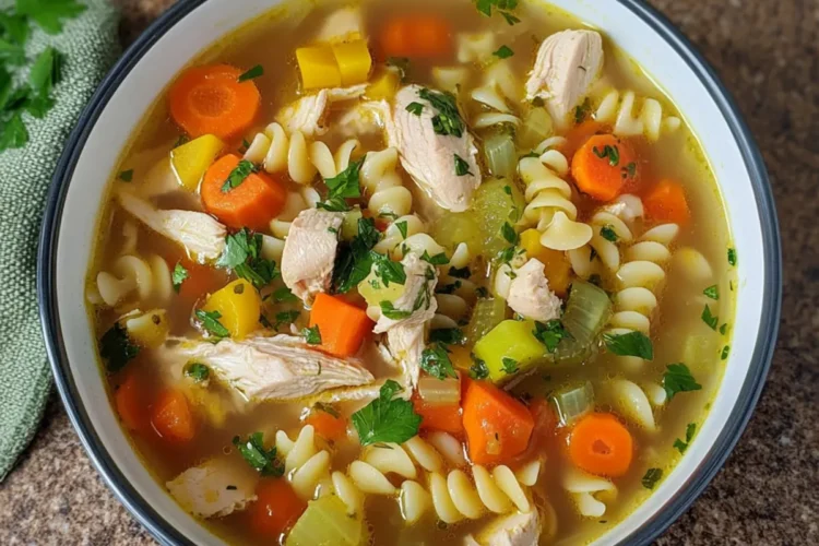 - Nachdem die Nudeln zart sind, passen Sie die Gewürze an und servieren Sie die heiße Hühnersuppe in Schalen.