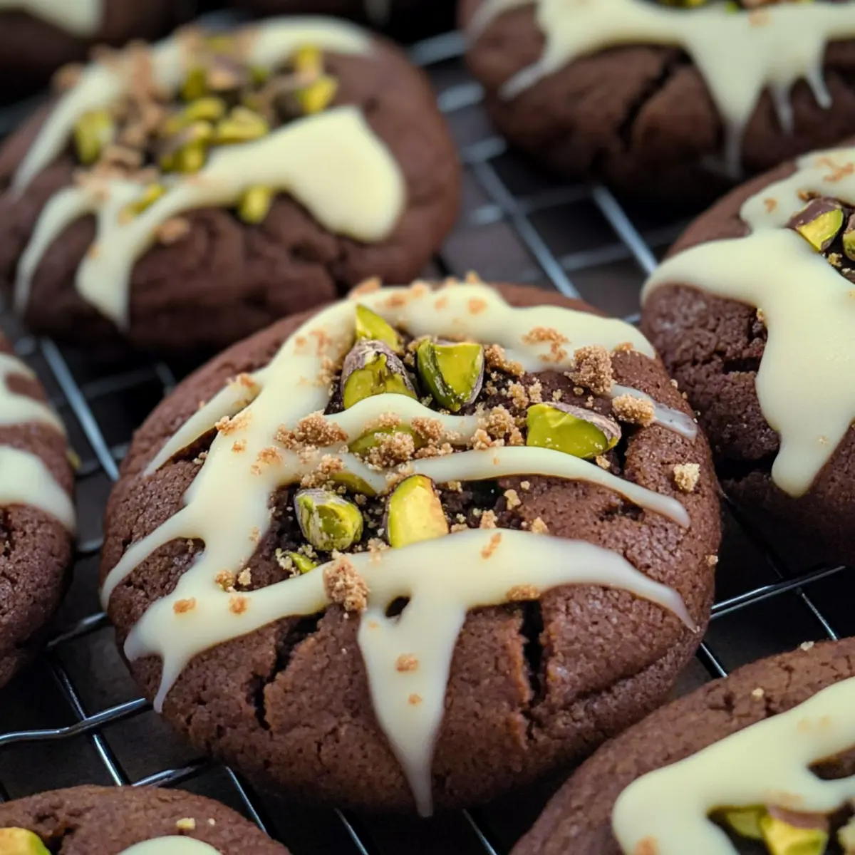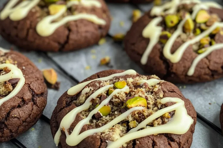 Sobald die Kekse fertig gebacken sind, lasse sie für etwa 10 Minuten auf dem Blech ruhen, bevor du sie auf ein Kuchengitter transferierst, um vollständig abzukühlen. Währenddessen die weiße Schokolade schmelzen und über die erkalteten Kekse träufeln, um eine ansprechende Dekoration zu schaffen. Diese letzte Berührung bringt einen süßen Kontrast zu den reichen, dunklen Aromen der Dubai Schokoladen Kekse.