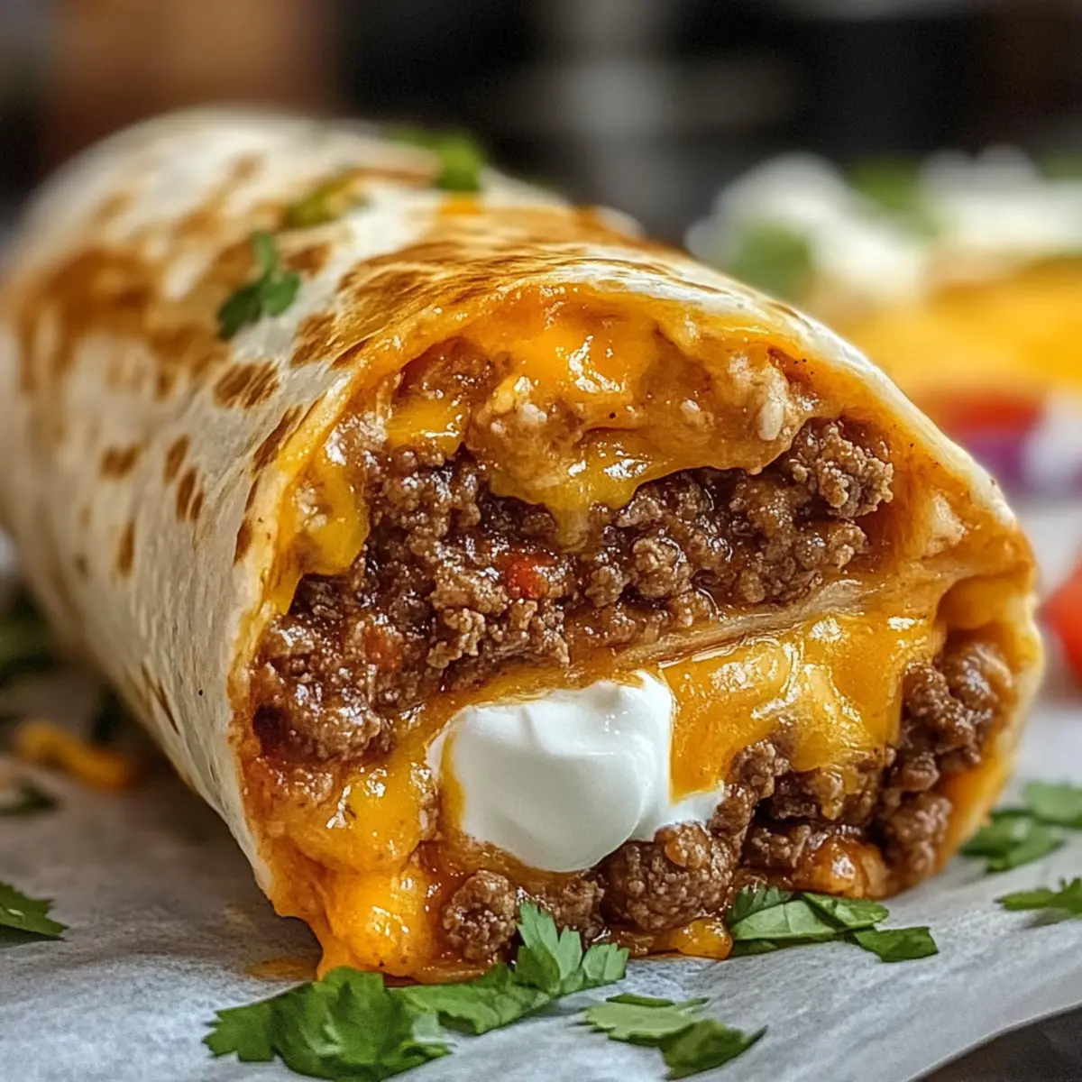 Platziere eine großzügige Portion der Rinderhackmischung in der Mitte der Tortilla. Füge nach Belieben einen Löffel Sauerrahm und einen Spritzer frischen Koriander hinzu. Achte darauf, nicht zu viel Füllung zu verwenden, damit der Burrito sich gut schließen lässt.