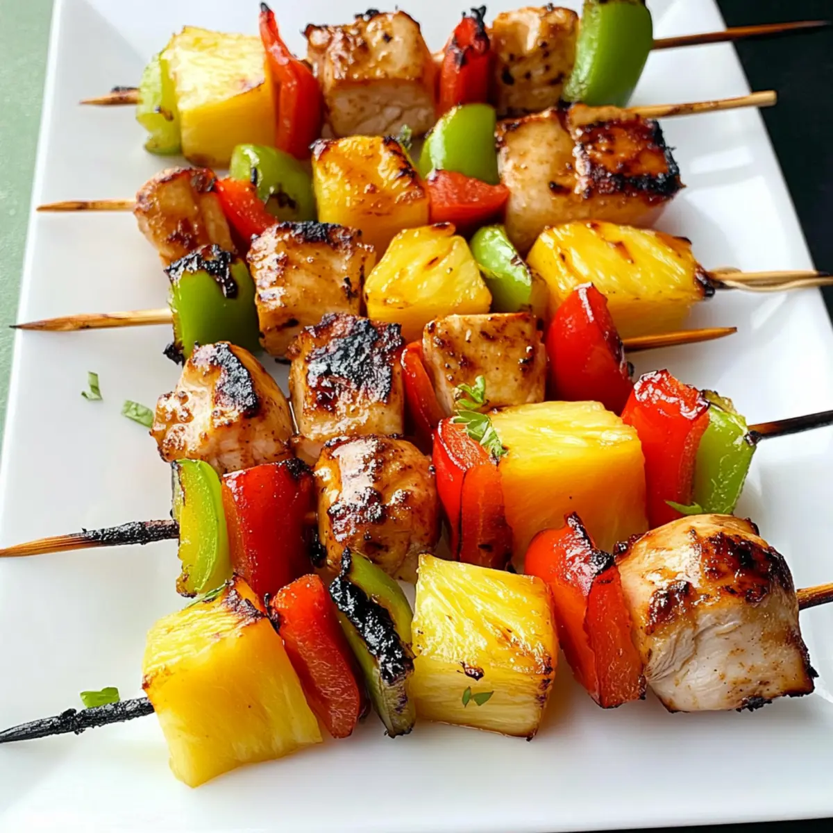 Die Textur und der Geschmack der gegrillten Gemüsesorten harmonieren hervorragend mit dem süßen Ananasgeschmack der Grillspieße. -