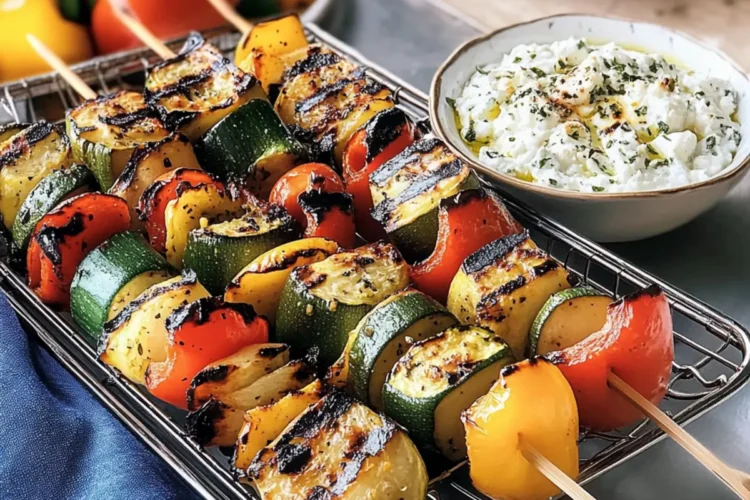 Grillspieße mit Gemüse und cremigem Feta-Dip