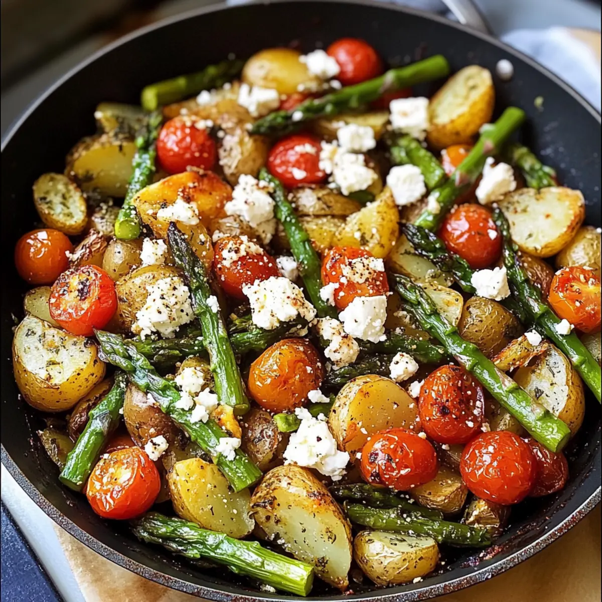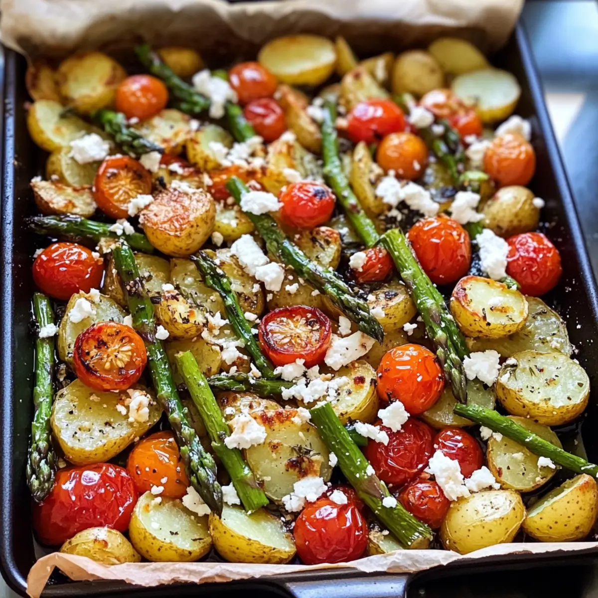 Nehme das Backblech aus dem Ofen und füge den grünen Spargel und die bunten Tomaten zu den Kartoffeln hinzu. Streue den zerkrümelten Feta gleichmäßig über das Gemüse. Diese Kombination wird köstliche Aromen freisetzen und das Bild des fertigen Gerichts aufhellen. Das Gemüse solle frisch und farbenfroh bleiben.
