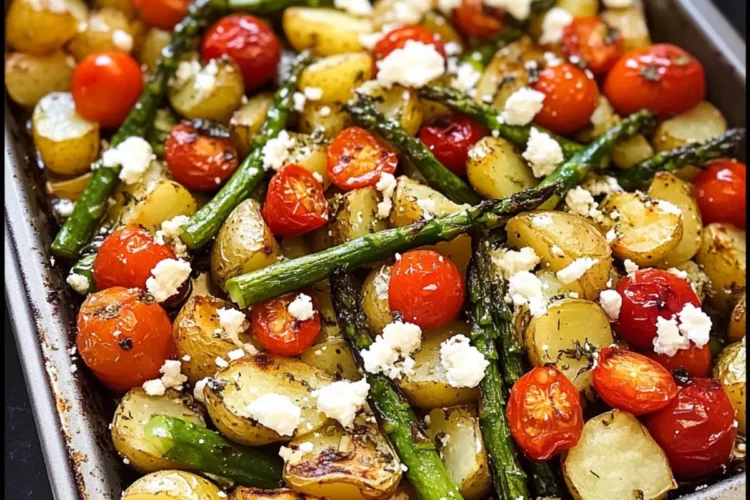 Entdecke dieses gesunde und leckere grüner Spargel Rezept mit Ofenkartoffeln, Tomaten und Feta – eine einfache One-Pan-Mahlzeit.