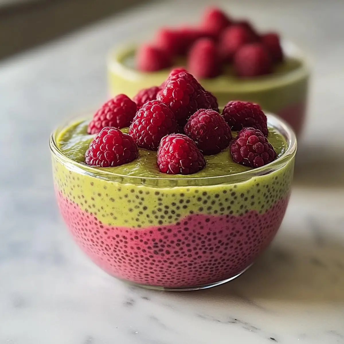 - Nehmen Sie beide Schichten aus dem Kühlschrank und bereiten Sie die Serviergläser vor. Beginnen Sie mit einer Schicht der Himbeer-Mischung, gefolgt von der Matcha-Mischung. Achten Sie darauf, dass die Schichten klar sichtbar sind. Garnieren Sie das Pudding mit frischen Himbeeren vor dem Servieren.