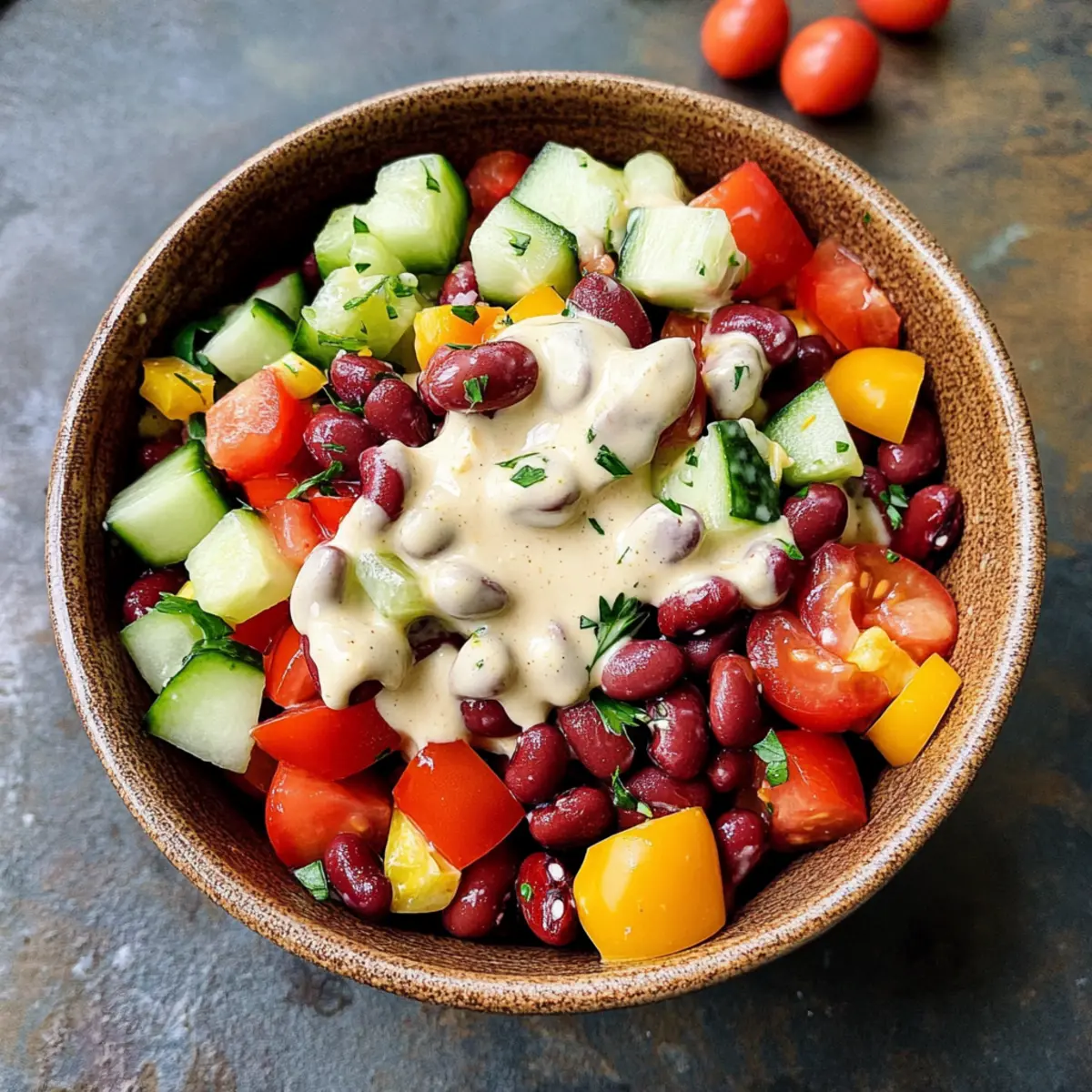 Vielfalt: Du kannst die Zutaten nach deinem Geschmack variieren – ob du Kichererbsen anstelle von Kidneybohnen verwendest oder den Tahini-Dressing durch einen Öl-Zitronen-Mix ersetzt, die Möglichkeiten sind endlos.