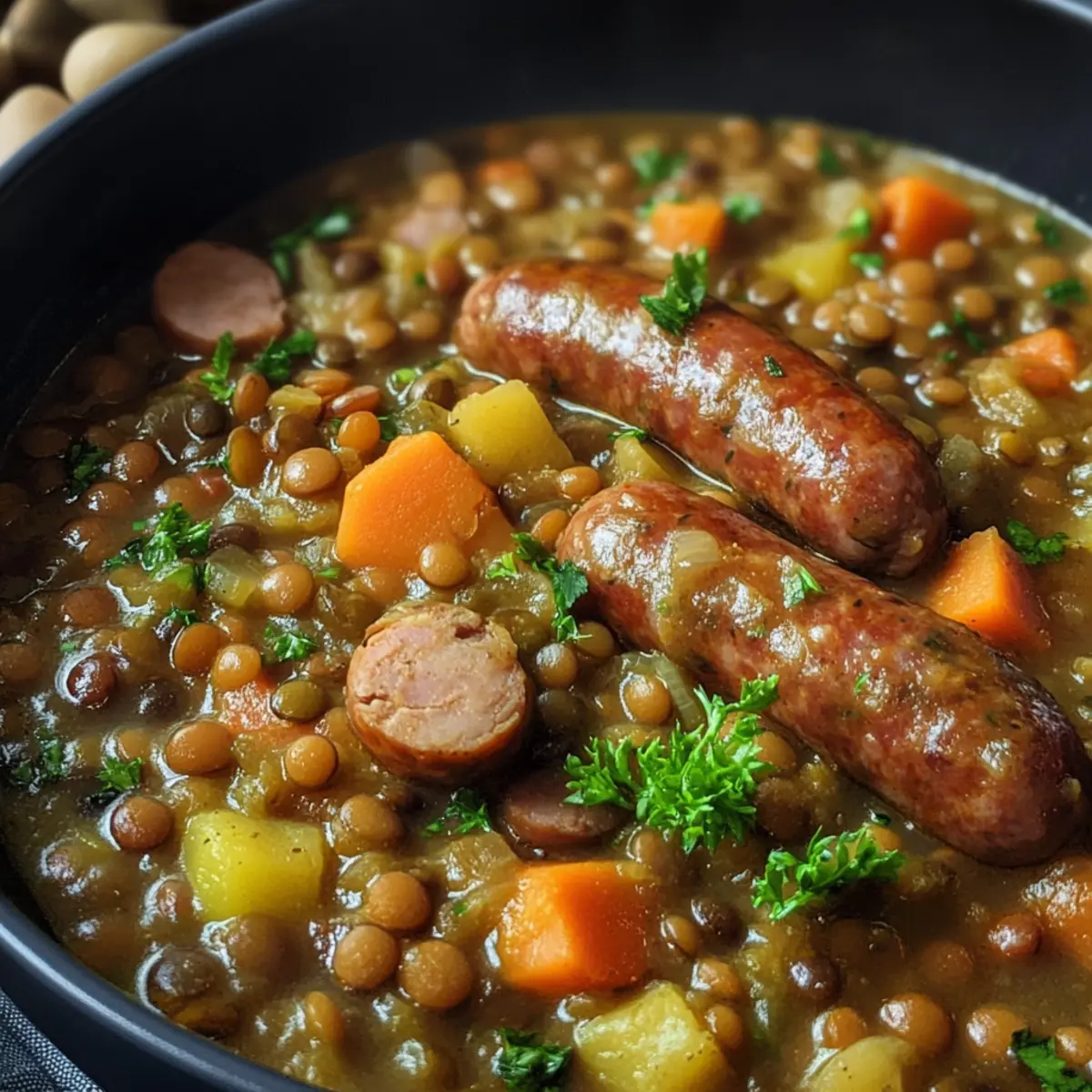 Temperaturen kontrollieren: Achten Sie darauf, dass der Eintopf nicht zu stark kocht, um ein Zerfallen der Linsen zu vermeiden. Sanftes Köcheln ist der Schlüssel.