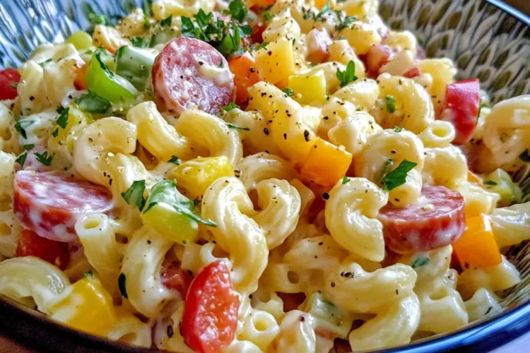 Ein köstlicher Nudelsalat mit frischem Gemüse, würziger Salami und einer cremigen Mayonnaise – perfekt für Sommertage!