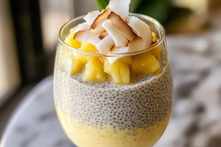 Genieße das erfrischende Piña Colada Chia Pudding mit Kokosnuss, Ananas und Chia-Samen für einen perfekten Start in den Tag.