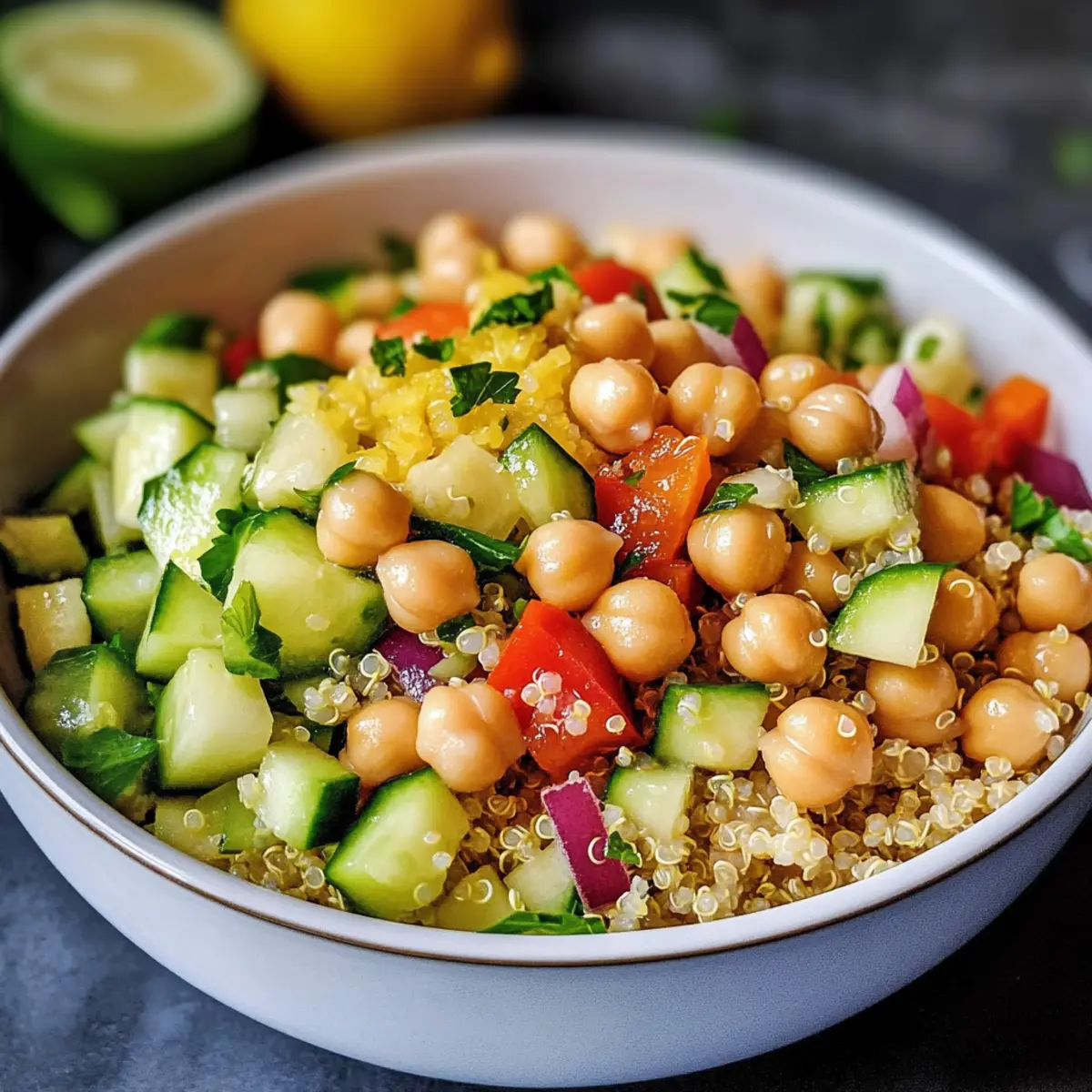 Immer häufig höre ich von Freunden, dass sie auf der Suche nach leichten und gesunden Rezepten sind, die sich schnell zubereiten lassen. Genau für solche Momente ist dieser Quinoa-Salat mit Kichererbsen perfekt geeignet! Die Kombination aus proteinreicher Quinoa, knackigem Gemüse und einer erfrischenden Zitronen-Vinaigrette macht ihn zu einem köstlichen Highlight, das nie langweilig wird. Egal, ob zum sommerlichen Picknick, beim Meal Prep für die Woche oder einfach als gesunde Beilage – dieser Salat bietet nicht nur einen hohen Nährstoffgehalt, sondern ist auch ein wahres Geschmackserlebnis. Wer würde da nicht gerne zugreifen? Bereit, deine Kochkünste auf die nächste Stufe zu heben und gleichzeitig gesunde Ernährung zu genießen?