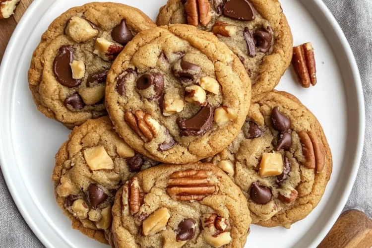- Füge die Butterscotch-Stückchen, dunklen Schokoladenstückchen und grob gehackten Pecannüsse hinzu und mische vorsichtig.
