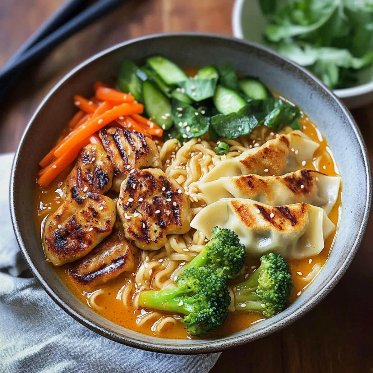 Knusprige Gyozas: Diese gefüllten Teigtaschen sind der ideale Begleiter. Ihr herzhafter Geschmack harmoniert perfekt mit der leichten Brühe.