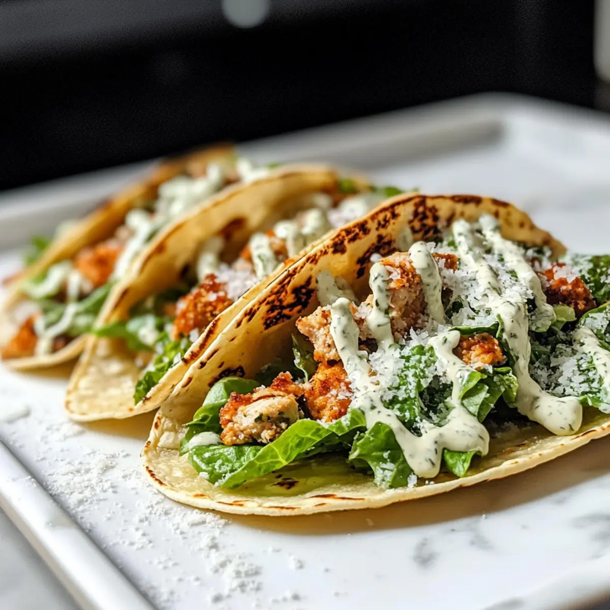 Falte jede Tortilla vorsichtig zusammen und serviere die Smash Chicken Caesar Tacos sofort. Für den besten Genuss solltest du sie heiß servieren, damit die knusprige Textur erhalten bleibt. Optional kannst du zusätzliches Caesar-Dressing beiseite stellen, um es beim Essen zu dippen.