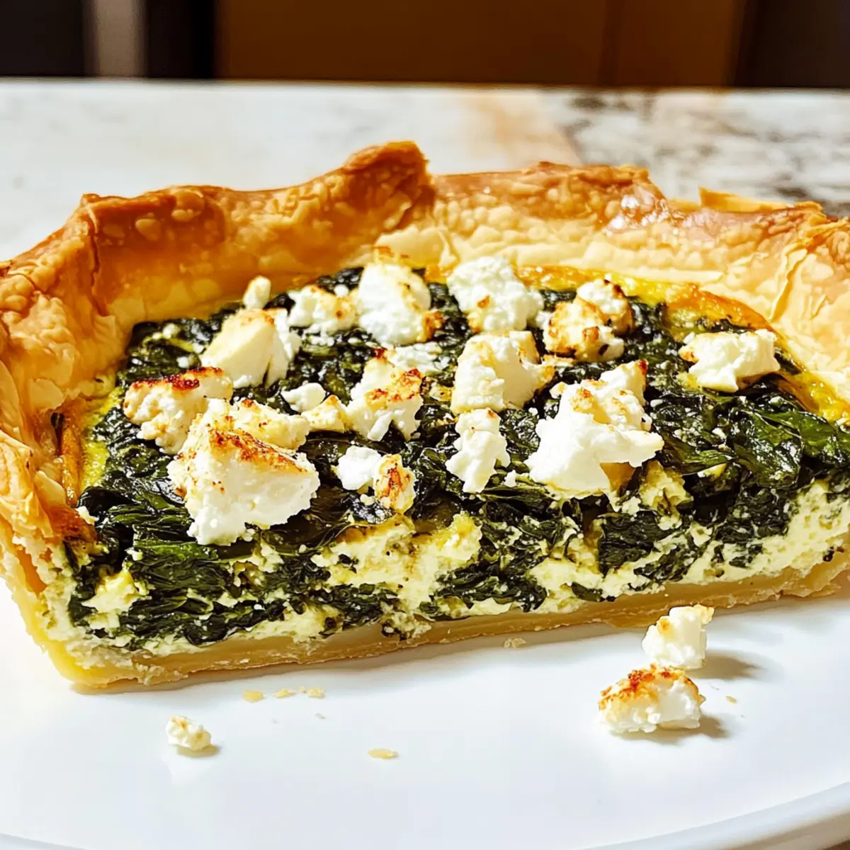 Gieße die Spinatfüllung gleichmäßig über die vorbereitete Filoteigkruste in der Quicheform. Achte darauf, dass die Füllung gleichmäßig verteilt ist. Damit stellst du sicher, dass jede Portion der Spinatquiche gleich köstlich wird. Streue zum Schluss zerbröckelten Feta-Käse gleichmäßig obendrauf.