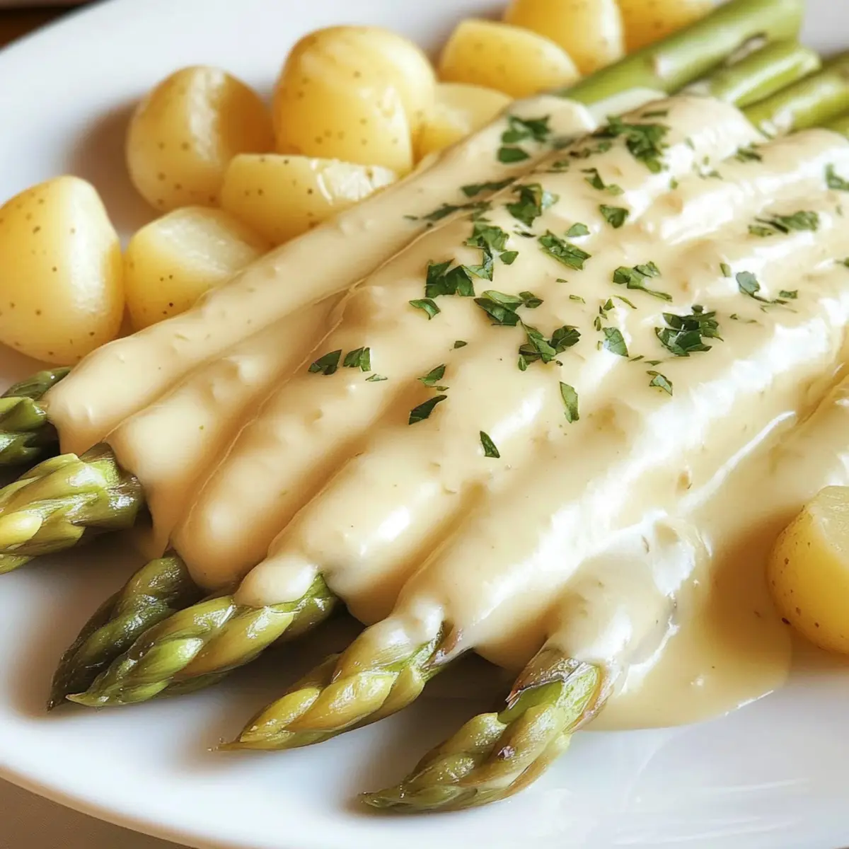 Die zarten Spargelstangen auf einem Teller anrichten und großzügig mit der Hollandaise Sauce überziehen. Die gekochten Kartoffeln abtropfen lassen, in Stücke schneiden und mit frischer Petersilie bestreuen. Serviere das Gericht warm und genieße die Kombination der Aromen von weißem Spargel mit der köstlichen Sauce Hollandaise!